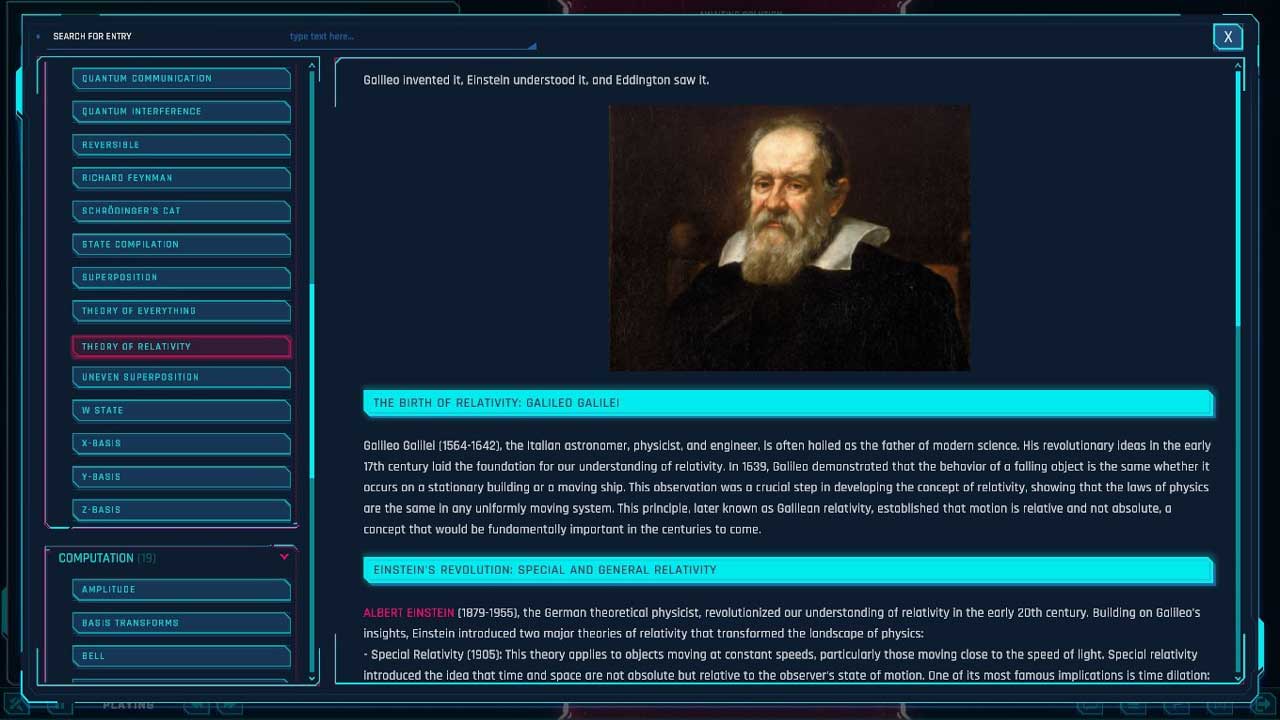 Në thelb është një simulator kuantik i shndërruar në një lojë. Është një arritje tepër mbresëlënëse, megjithëse është e pamundur për mua ta gjykoj nga perspektiva e dikujt që është i ri në informatikën kuantike. Nuk e kam eksploruar plotësisht atë që loja ka për të ofruar ende, por ka shumë gjëra që po ndodhin tani, dhe nëse jeni dikush që është i interesuar në këtë fushë, por nuk doni të filloni me një libër shkollor, ia vlen investimi. Ekziston një wiki i detajuar në lojë nëse jeni kuriozë për historinë e fushës dhe disa nga temat më specifike/të vështira brenda saj.