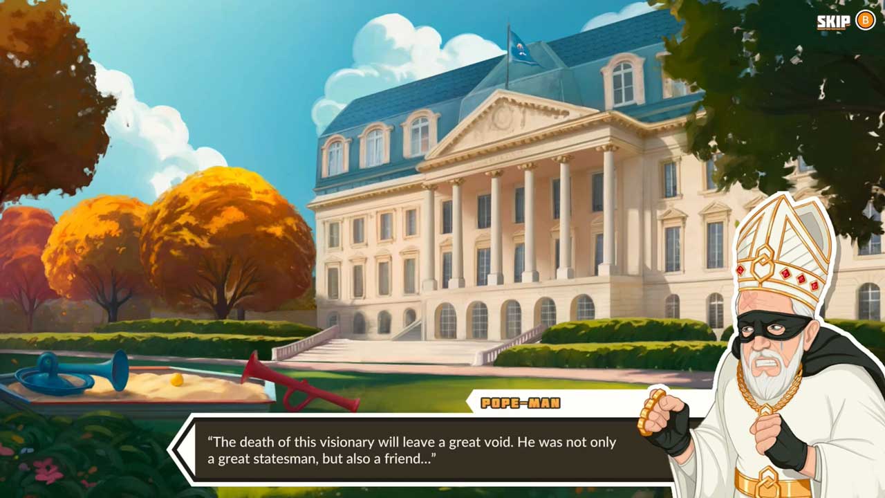 Narrativa e lojës është e ekzagjeruar. Vdekja e “Theorn BrunceWald, presidentit botëror”, përgatit skenën për një lojë politike absurde dhe të lirë. Tani është koha e përsosur që udhëheqësit e tjerë botërorë të ndërmarrin veprime për dominim global – dhe kështu fillon Super World War. Kjo është satirë në formën e saj më të mirë – kaotike, kaotike dhe e ekzagjeruar pa turp.